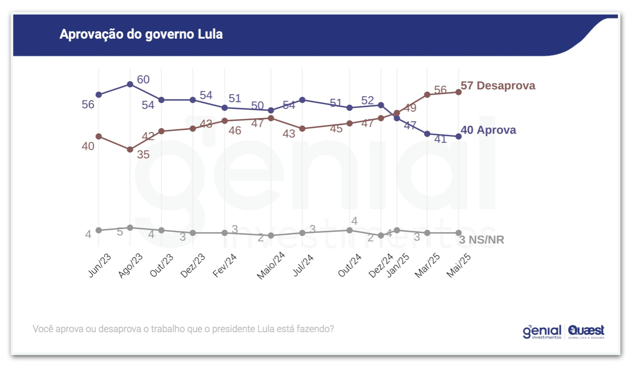 O levantamento mostra que 57% desaprovam a terceira administração do petista, enquanto 40% aprovam. Não sabem ou não responderam são 3%.