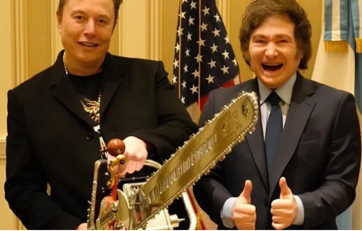 “Isso é legal”, afirmou Musk sobre a motossera com com a inscrição “Viva la libertad, carajo” gravada na lâmina –a frase faz parte do slogan de campanha do argentino; no entanto, a palavra “carajo” não tem a mesma conotação pejorativa quanto a sua equivalente em português.