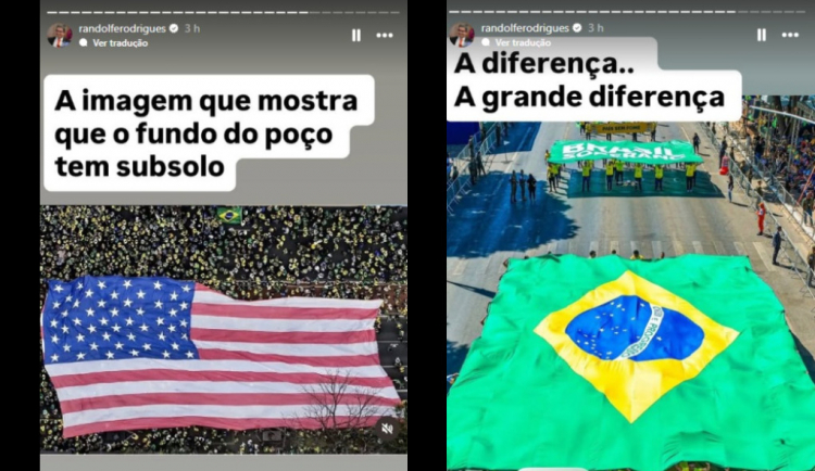 “A imagem que mostra que o fundo do poço tem subsolo. 07/09/2025 – Que a história nunca esqueça deste dia”, escreveu o senador em um “story” no Instagram, ao postar uma foto da bandeira americana na manifestação bolsonarista em São Paulo. Na postagem seguinte, Randolfe publicou a bandeira do Brasil no desfile de 7 de setembro na Esplanada, em Brasília, ao qual o presidente Luiz Inácio Lula da Silva (PT) compareceu. “A diferença. A grande diferença”, disse Randolfe na legenda.